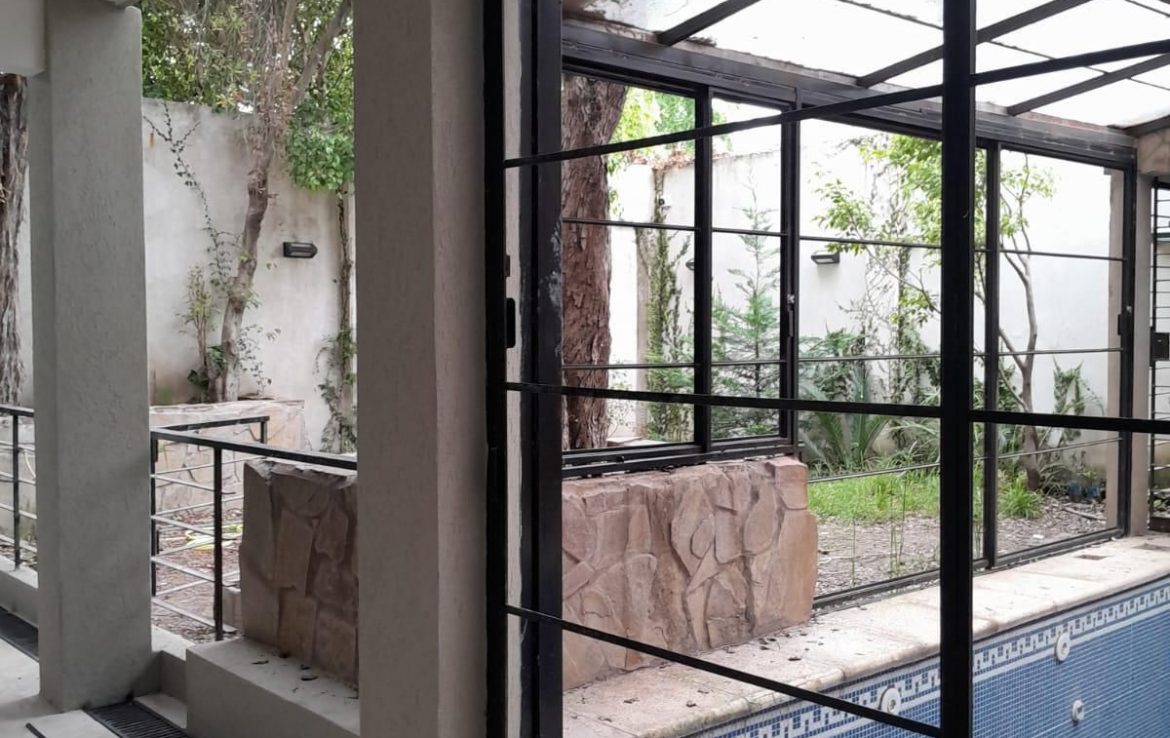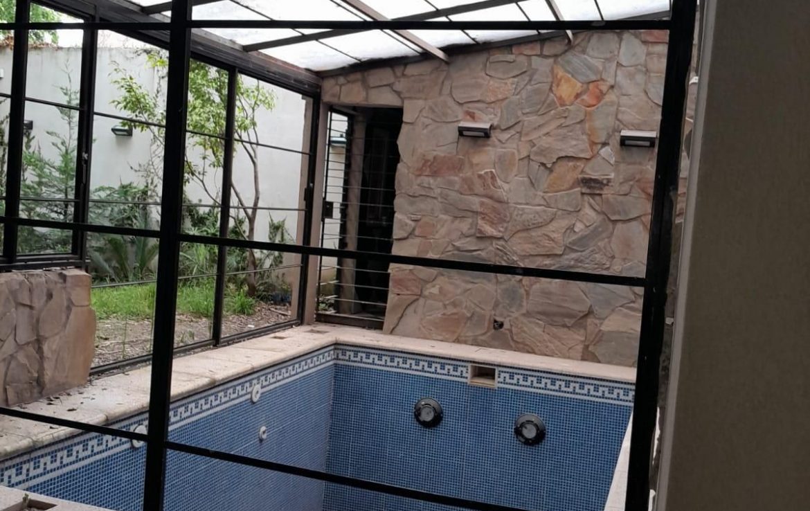 Extensa galería con parrilla, piscina climatizada con cerramiento de policarbonato y cuarto al fondo con baño y ducha.