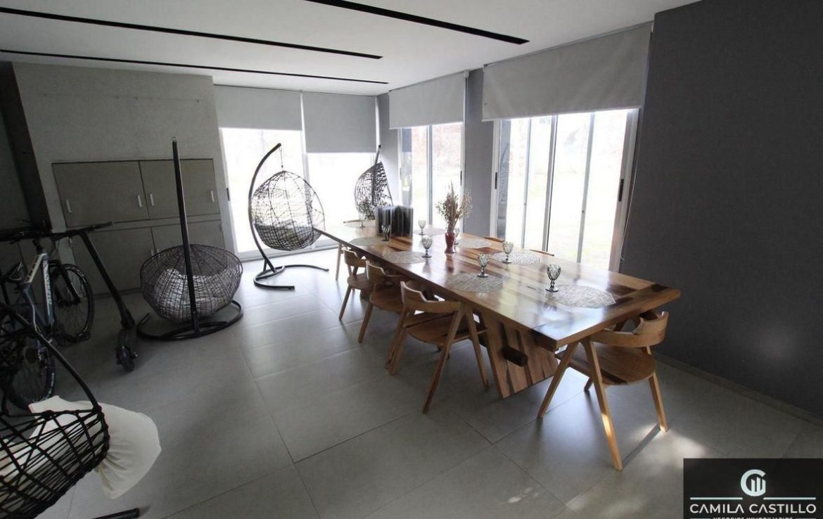 Planta baja: Living comedor con cocina integrada y mesa desayunadora, toillete, dependencia de servicio, lavadero, baño completo, quincho completo con baño, parrilla exterior con mesada, garage y espacio para estacionamiento de hasta 10 vehículos, hermoso jardín con fuente.