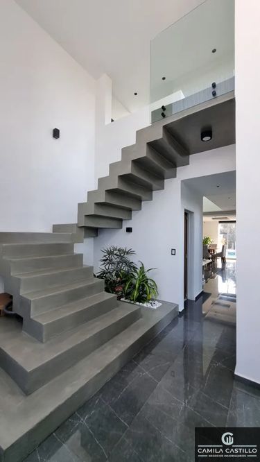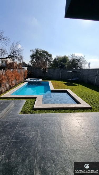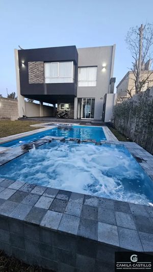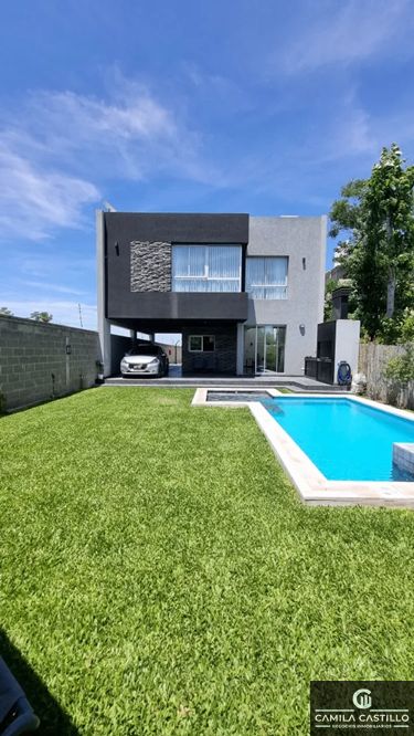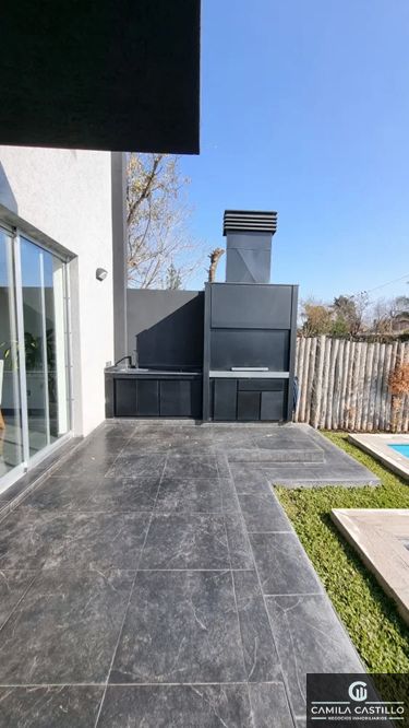 Exterior: Cochera pasante para hasta cinco vehículos, patio con parrilla y mesada, hermoso parque con piscina, espejo de agua y jacuzzi.
